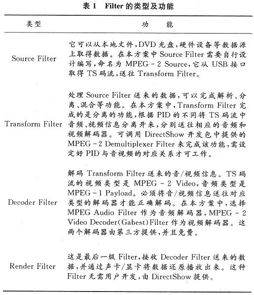 軟件方面,PC機(jī)端應(yīng)用程序的核心部分是實(shí)時(shí)播放器,需要播放的是TS碼流,這是MPEG-2標(biāo)準(zhǔn)定義的一種碼流。本方案采用基于DirectShow技術(shù)搭建的媒體播放器。DirectShow是DirectX家族中的成員,它為在Windows平臺(tái)上處理各種格式的多媒體文件的回放、音視頻采集等高性能要求的多媒體應(yīng)用提供了完整的解決方案,重要的是它很好地支持了MPEG-2標(biāo)準(zhǔn),它使應(yīng)用程序開(kāi)發(fā)人員從復(fù)雜的數(shù)據(jù)傳輸、硬件差異、同步性等工作解脫出來(lái),總體應(yīng)用框架和底層工作由DirectShow來(lái)完成,大大加快了開(kāi)發(fā)進(jìn)度。