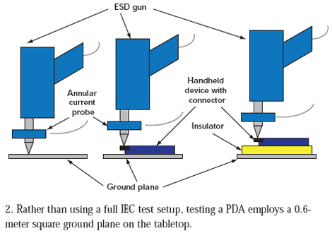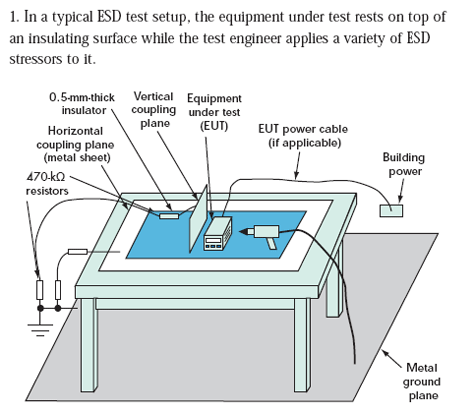 對(duì)于小型產(chǎn)品來(lái)說,工程師經(jīng)常在專門的測(cè)試環(huán)境中執(zhí)行系統(tǒng)級(jí)ESD測(cè)試(圖1)。對(duì)IEC61000-4-2測(cè)試而言,這些測(cè)試環(huán)境包括:地板上的金屬接地板、木桌、放在桌子上的金屬水平耦合板(到接地板有個(gè)0.95米長(zhǎng)的連線,在水平耦合板之上的一個(gè)0.5mm絕緣層)。