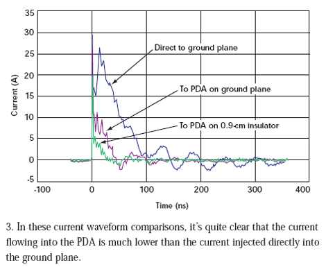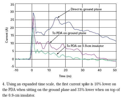 但是,我們見到的電流減小前后并不一致。當(dāng)PDA直接放在接地板上時(shí),初始電流尖峰降低了10%。當(dāng)PDA放在0.9cm絕緣層上時(shí),初始電流尖峰減低33%(圖4)。在20ns點(diǎn),直接放在接地板上的PDA受到的沖擊要小69%,而位于絕緣層上的PDA受到的沖擊要小93%。電流減少是在沖擊狀態(tài)下給PDA充電的結(jié)果。在每次沖擊測(cè)試過程結(jié)束后,我們必須將PDA接地使它回到未充電狀態(tài)才能進(jìn)行下次測(cè)量。