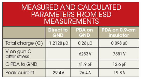 對(duì)充電到PDA的電流進(jìn)行積分,可以得到從ESDqiang轉(zhuǎn)移到PDA的電荷數(shù)量。從ESDqiang轉(zhuǎn)移到PDA的電荷量可以用來(lái)計(jì)算ESDqiang的150pF電容上剩下的電壓,然后再算出PDA上的電壓。理解這個(gè)電壓以及PDA上測(cè)到的電荷之后,就可以計(jì)算出PDA和接地板之間的電容(見表1)。