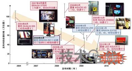 我們把目光移向最新機種上配備的LED背照燈,可以看出面向普及價格開發(fā)的方向性。2010年1月發(fā)布的索尼的BRAVIA EX700與夏普的LED AQUOS S兩機種都是很好的例子。對LED等的改善使得40英寸機種的設想價格可以下降到大約17~18萬日元。