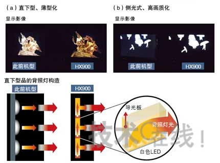 圖2 薄型機種也有區(qū)域亮度控制 索尼分別發(fā)布了直下型薄型化的LED背照燈電視(a),和可控制區(qū)域亮度的側(cè)光式LED背照燈的LCD TV(b)。均采用白色LED光源。(據(jù)索尼的資料制作)
