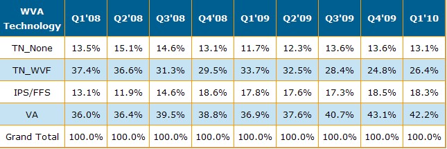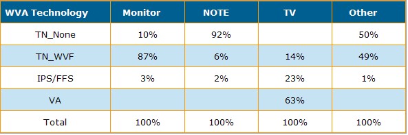 下表則表示了2010年第一季在不同的應用方面各種不同的視角技術(shù)的比重?;旧显贜otebook 以及LCD Monitor的面板只有相當少的比重采取了高階的IPS或VA的技術(shù),而在LCD TV的部份,VA型的出貨面積高達60%。