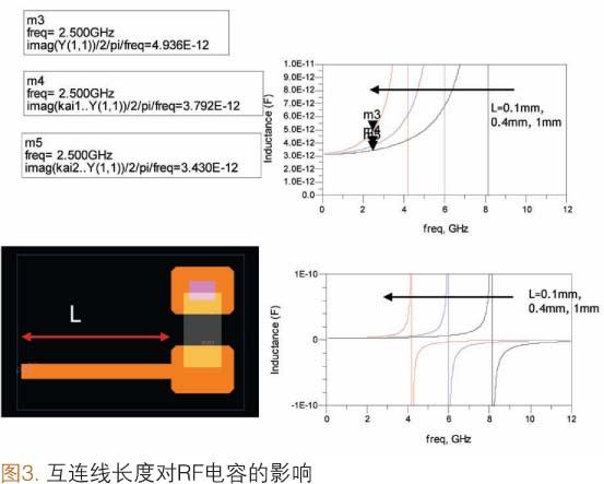 圖3是RF頻段下單個SMD焊盤的互連線長度對電容影響的簡單實例。在這種情況下,3.0pFSMD電容的一個電極連接在M2層上,形成接地電容。100.0μm寬的互連線與另一個電極連接在一起。在2.5GHz頻段下,1.0mm長的互連線可使SMD電容器的等效電容增長到4.9pF(增大了63%)。當然,互連線越短,等效電容與本征電容(3.0pF)的值就越接近。然而,通常使用長互連線連接SMD元件是不可避免的。在這種情況下,考慮互連線對電容的影響就顯得異常重要(有時把這種方法稱為對電容的微調(diào)),否則SiP將無法正常工作。