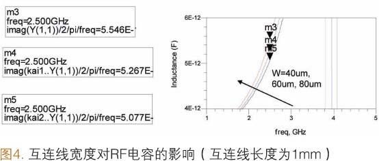 [page]除互連線長度之外,互連線的寬度也會對RF電容產(chǎn)生影響。在襯底的制作過程中,線寬通常會發(fā)生變化(舉例來說,與設(shè)計寬度相比,實際線寬的變化范圍為±10.0μm~±15.0μm)。如圖4所示,如果設(shè)計的互連線為1.0mm長,60.0μm寬,實際卻達到40.0μm寬,在2.5GHz下等效電容變化將達到5.3%(以3.0pF接地SMD電容為例)。如果把這種SMD電容用于濾波器中,對于RF應(yīng)用來說,電容值5.3%的變化將導(dǎo)致約2.7%的頻移。我們必須對RF應(yīng)用中含有SMD電容的RFSiP模塊的襯底制造容差進行細致研究。