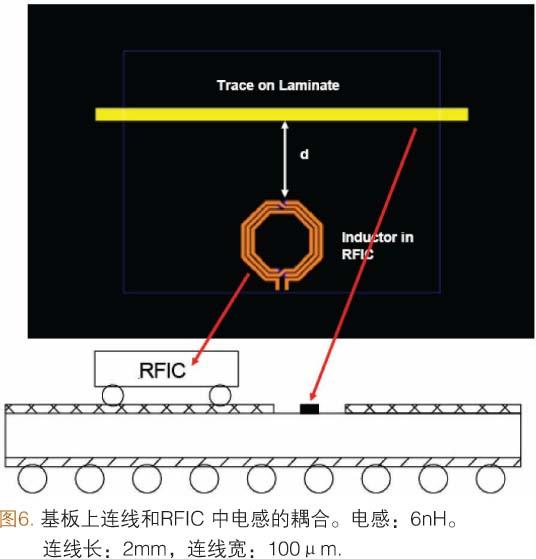 為了對主時鐘線和RF元件之間的相互作用進行分析,把壓控振蕩器(VCO)中使用的RF電感(6.0nH)放置在穿通多層襯底的時鐘互連線附近(圖6)。我們在這個研究中使用的互連線長為2.0mm。當VCO電感和互連線之間的橫向距離(d)大于0.5mm時,產(chǎn)生的耦合信號將小于-80.0dB。耦合信號的實際要求由SiP系統(tǒng)級電設(shè)計決定。