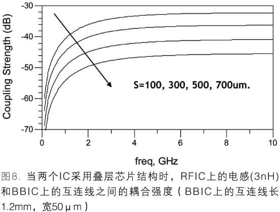 圖8表示了BBIC和RFIC電感之間的耦合強度(未使用隔離層)。假設(shè)BBIC和RFIC的厚度為250.0μm時,對VCO電路中的3nH電感進行了研究。BBIC中主時鐘的互連線設(shè)置為1.2mm長。根據(jù)模擬結(jié)果,當橫向距離(S)為100.0μm時,2.5GHz下的隔離為-35dB。這一隔離值對大多數(shù)RF應(yīng)用來說是不夠的。當橫向距離為700.0μm時,隔離值提高為-50dB,這個值對大多數(shù)RF應(yīng)用來說仍然不夠。為保證VCO電感的性能,位于BBIC電感上方的主時鐘不能使用長互連線。根據(jù)以上分析,我們還應(yīng)對RFSiP使用的疊層芯片法做進一步研究,從而判斷BBIC和RFIC器件之間出現(xiàn)嚴重相互干擾的可能性。