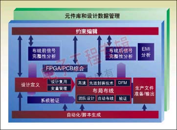 圖1表明了一個典型的由前端到后端的綜合系統(tǒng)設(shè)計。它始于設(shè)計定義(原理圖輸入),該設(shè)計定義與約束編輯緊密集合在一起。在約束編輯中,設(shè)計者既可定義物理約束又可定義電氣約束。電氣約束將為網(wǎng)絡(luò)驗證驅(qū)動仿真器進(jìn)行布局前和布局后分析。仔細(xì)看看設(shè)計定義,它還與FPGA/PCB集成相鏈接。FPGA/PCB集成的目的是為了提供雙向集成、數(shù)據(jù)管理和在FPGA與PCB之間執(zhí)行協(xié)同設(shè)計的能力。