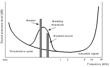 它們使用了三大關(guān)鍵技術(shù)。當(dāng)要剔除低于最小聽覺(jué)閾值的聲音時(shí),使用頻率屏蔽技術(shù)。當(dāng)一個(gè)大幅度信號(hào)非常接近另一個(gè)較低幅度的信號(hào)時(shí),使用幅度屏蔽技術(shù)。從而小信號(hào)被大信號(hào)屏蔽,因此小信號(hào)將不被編碼。最后,當(dāng)不同音調(diào)在時(shí)間上非常接近時(shí),使用時(shí)間屏蔽技術(shù)。從而可屏蔽掉在一個(gè)較柔和聲音前或后的高音,并把它丟棄掉。