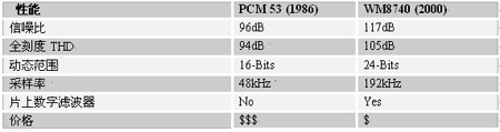 在過(guò)去的15年里,ADC和DAC系統(tǒng)的性能一直在穩(wěn)定地增長(zhǎng)。下面的音頻DAC表簡(jiǎn)要列出了今天最先進(jìn)的DAC和1986年最先進(jìn)的DAC之間的性能比較?,F(xiàn)在,將廣泛的數(shù)字濾波技術(shù)集成進(jìn)今天的DAC轉(zhuǎn)換器中不僅在技術(shù)上是可行的,而且也非常經(jīng)濟(jì)。如WolfsonMicroelectronics公司的DAC器件WM8740具有完全支持最新DVD-Audio標(biāo)準(zhǔn)、CD和其它使用PCM格式數(shù)據(jù)的數(shù)字音頻系統(tǒng)的架構(gòu)。