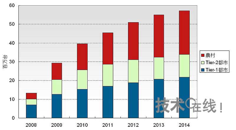 由于中國的城市人口不斷增加,2014年將超過中國人口的一半,達(dá)到56%,較10年前增長14%。我們首次將中國的液晶電視需求按照“一線城市”、“二線城市”及“農(nóng)村”的劃分進(jìn)行了預(yù)測。在農(nóng)村,目前正在由顯像管電視向平板電視過渡,一線城市和二線城市每戶家庭擁有的電視數(shù)量將增加。根據(jù)經(jīng)濟的增長程度,電視需求甚至有望超出預(yù)測。我們預(yù)測,2014年中國液晶電視需求中,城市約占60%,增長至3400萬臺左右(圖2)。