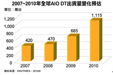 平價一體式桌上型計算機(jī)(All In One PC;AIO PC)在2009年創(chuàng)下685萬臺,成長45.7%后,DIGITIMES Research預(yù)估2010年將進(jìn)一步提高至1,115萬臺,成長62.8%,展現(xiàn)新興產(chǎn)品的強(qiáng)勁成長力道。