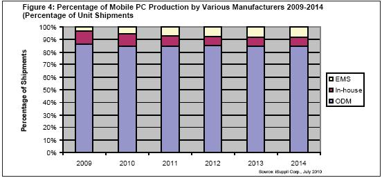 圖4所示為iSuppli公司對(duì)移動(dòng)PC產(chǎn)量份額的預(yù)測,按制造商類型細(xì)分。