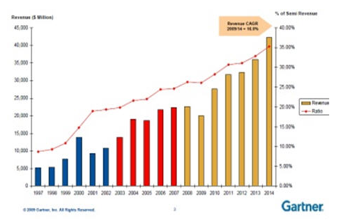 桉Gartner觀(guān)察,在明年的Q4時(shí),僅TSMC,GlobalFoundries及三星加在一起,在45nm及以下制程的300mm硅片月產(chǎn)能達(dá)約280,000片,而2009 Q4時(shí)僅70,000片。今年TSMC與GlobalFoundries兩家計(jì)劃總投資達(dá)79億美元。