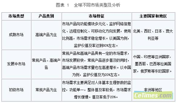 醫(yī)療設(shè)備的發(fā)展與國家和地區(qū)的經(jīng)濟發(fā)展水平、醫(yī)療政策以及當?shù)鼐用袷杖胨较⑾⑾嚓P(guān),這些因素導(dǎo)致全球醫(yī)療監(jiān)護儀市場發(fā)展不平。根據(jù)市場特征以及對產(chǎn)品需求的不同可以將醫(yī)療監(jiān)護儀市場分為成熟市場、發(fā)展中市場和初級市場。