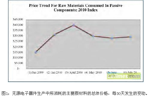 在7月份,無(wú)源電子器件在生產(chǎn)過(guò)程中所消耗原材料的帕曼指數(shù)(Paumanok index)增長(zhǎng)了4%。這標(biāo)志著,在2010年4月急劇上漲之后的原材料價(jià)格整體下降的局面已經(jīng)臨近結(jié)束(圖1)。