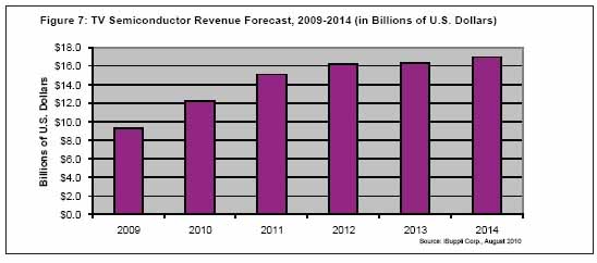 2009年電視半導(dǎo)體銷售額高達(dá)93億美元,由于液晶電視需要更多的半導(dǎo)體芯片支持各種高級(jí)功能,2010年銷售額有望更上層樓。iSuppli公司的預(yù)測(cè)顯示,2010年電視半導(dǎo)體市場(chǎng)將達(dá)到121億美元。