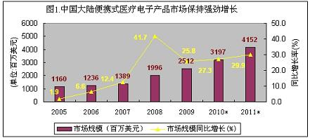 2005-2009年,中國大陸便攜式醫(yī)療電子產(chǎn)品市場呈現(xiàn)出加速增長勢態(tài),年復(fù)合增長率高達(dá)30.8%,幾乎沒有受到金融危機(jī)的影響。2009年市場總規(guī)模達(dá)到25.12億美元,增長速度達(dá)到25.8%占醫(yī)療電子產(chǎn)品總市場的53.2%。在便攜式醫(yī)療電子市場中,家用的占六成以上的份額,電子血壓計(jì)、便攜式血糖儀和電子助聽器占據(jù)了90%以上的銷售份額。由于目前市場處于普及的初級階段,中國人口基數(shù)大,國人健康意識(shí)的提升,整個(gè)便攜式醫(yī)療電子市場需要面對的是中國內(nèi)需市場,不存在市場飽和所謂的受金融危機(jī)影響。所以家用便攜式醫(yī)療電子產(chǎn)品市場前景非常好,便攜式、信息化、低功耗、低成本以及安全性是市場關(guān)注的熱點(diǎn)。展望未來,中國便攜式醫(yī)療電子市場前景非常誘人,在未來兩年,中國便攜式醫(yī)療電子產(chǎn)品市場規(guī)模年復(fù)合增長率可接近30%,2010年市場規(guī)模將接近32億美元,2011年會(huì)超過40億美元。(見下圖)。