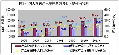 據(jù)統(tǒng)計(jì)分析,2009年中國大陸醫(yī)療電子本地產(chǎn)品銷售額比2008年增長18%,接近47億美元,其中便攜式醫(yī)療電子銷售額同比增長19%,達(dá)到27.38億美元。預(yù)計(jì)2010年醫(yī)療電子銷售額將繼續(xù)高速增長,超過56億美元。其中便攜式醫(yī)療電子產(chǎn)品銷售額可超過34億美元。從2005~2009年中國大陸醫(yī)療電子產(chǎn)品總銷售額的年復(fù)合增長率達(dá)15.9%,其中便攜式產(chǎn)品的年復(fù)合增長率達(dá)23.5%(見下圖)。
