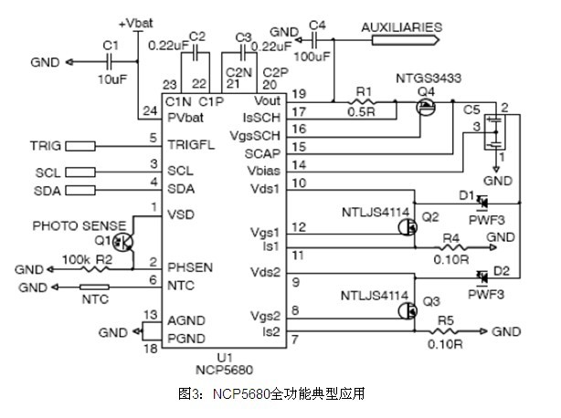 要在弱光下拍得高分辨率照片的數(shù)碼相機(jī)需要高亮度閃光。雖然白光LED能提供這個(gè)等級(jí)的光能,但需要比電池所提供的高出近400%的能量。以安森美半導(dǎo)體的NCP5680為例,它配合電池管理及超級(jí)電容來驅(qū)動(dòng)LED閃光至充分亮度,提供達(dá)10 A的大峰值電流。NCP5680的集成驅(qū)動(dòng)器還可管理超級(jí)電容,處理其他峰值功率功能,如變焦、自動(dòng)對(duì)焦、音頻、視頻、無線傳輸、GPS數(shù)據(jù)讀取及射頻(RF)放大,延長電池使用時(shí)間又兼顧纖薄型設(shè)計(jì),節(jié)省開發(fā)時(shí)間、電路板空間及元器件成本,見圖3。