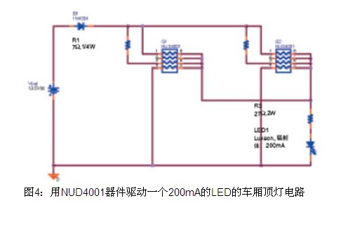 NUD4001提供了一種滿足汽車應(yīng)用的低成本解決方案。與采用線性或開關(guān)穩(wěn)壓器相比,它的設(shè)計(jì)更簡便,可以構(gòu)成更簡單而且成本更低的電路,見圖4。