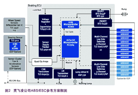 英飛凌在與世界主要ABS/ESC供應商的合作過程中不斷總結(jié)經(jīng)驗,并結(jié)合自己全面的產(chǎn)品線,開發(fā)出了獨具特色的ABS/ESC參考方案供客戶在此基礎上開發(fā)自己的方案。經(jīng)過日積月累地改進這個方案目前的版本如下圖所示(圖2)。這個方案圖中包括了ABS和ESC兩種方案。整個圖描述的是一個ESC系統(tǒng),如果去掉方向盤轉(zhuǎn)角傳感器、橫擺角傳感器和加速度傳感器組以及右下角用來控制四個額外電磁閥線圈的芯片,剩下的器件組成的就是一個ABS系統(tǒng)。