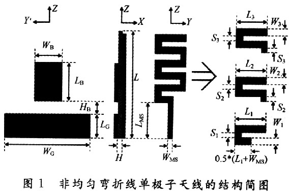 非均勻彎折線的單極子天線結(jié)構(gòu)如圖1所示?;暹x用Rogers4350B基板,厚度為0.762mm,相對(duì)介電常數(shù)為3.48。為了分析方便,將輻射元分成了3段;天線的饋電采用了50Ω的微帶線。