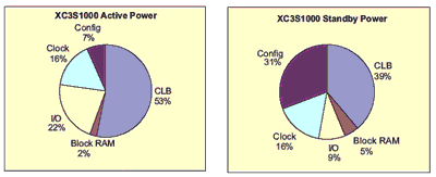 圖2所示為XC3S1000的活動功耗和待機功耗分解圖。據(jù)報告顯示,活動功耗是設(shè)計在高溫下活動時的功耗,包括動態(tài)和靜態(tài)功耗兩部分。待機功耗是設(shè)計空閑時的功耗,由額定溫度下的靜態(tài)功耗組成。CLB在活動功耗和待機功耗中占最主要部分,這不足為奇,但其他模塊也產(chǎn)生可觀的功耗。I/O和時鐘電路占全部活動功耗的1/3,如果使用高功耗的I/O標準,其功耗還會更高。[page]