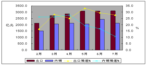 五、內(nèi)外銷增速差距拉大,出口依存度繼續(xù)提高。今年以來,隨著外需不斷回暖,外銷出現(xiàn)持續(xù)增長,到7月底,外銷增速已經(jīng)連續(xù)5個(gè)月超過30%,并超過內(nèi)銷增速6.5個(gè)百分點(diǎn)。其中,內(nèi)銷產(chǎn)值14086億元,同比增長23.9%,比上半年回落3.3個(gè)百分點(diǎn),低于產(chǎn)業(yè)平均增速3.7個(gè)百分點(diǎn);出口交貨值19752億元,同比增長30.4%,高于產(chǎn)業(yè)平均增速2.8個(gè)百分點(diǎn)。產(chǎn)業(yè)出口依存度(58.4%)比去年同期提高1.3個(gè)百分點(diǎn),比上半年提高0.3個(gè)百分點(diǎn)。