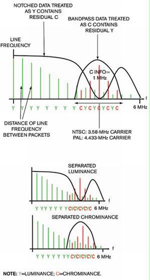 色度信息置于頻譜的高端,為線路長度的倍數(shù)。顯示方面的難題在于如何正確地提取亮度信息和色度信息,以及如何在未造成顯示偽像的情況下保持全帶寬。
