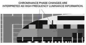 如果沒有發(fā)生亮度-色度分離,載波正循環(huán)或反循環(huán)時,顏色信息使畫面更亮或更暗。同時顏色信息也會錯誤地出現(xiàn)在圖像的黑白部分(圖2)。