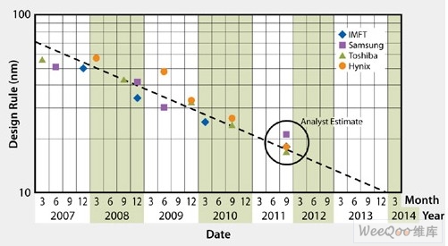 圖1:NAND閃存技術(shù)的制造工藝幾何尺寸變化趨勢(shì)。