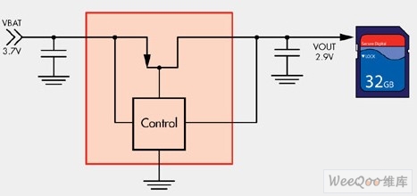 對(duì)于低速工作的小容量SD卡,耗電量常常小于100mA。假設(shè)鋰離子電池的額定工作電壓為3.7V,且存儲(chǔ)器的電源軌相當(dāng)高,則線性調(diào)節(jié)器就成為SD存儲(chǔ)器的電源選擇。不過,選定的線性調(diào)節(jié)器必須能以低壓降(LDO)方式工作,因?yàn)殇囯x子電池的有效電壓范圍在3.2至4.2V之間。