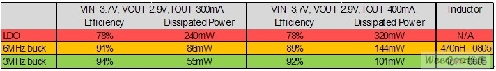 表1:LDO與6MHz降壓轉(zhuǎn)換器和3MHz降壓轉(zhuǎn)換器的電源效率與功耗對(duì)比。
