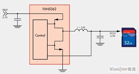 圖4:FAN5362降壓轉(zhuǎn)換器實(shí)現(xiàn)2.9VSD卡的供電電路。