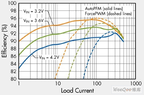 按照表1的計(jì)算,對(duì)于300mA的系統(tǒng),F(xiàn)AN5362能把功耗降至55mW;對(duì)于400mA的系統(tǒng),F(xiàn)AN5362能將功耗降至101mW。這些效率值根據(jù)所測(cè)得的FAN5362效率曲線而獲得。圖5顯示了AutoPFM(實(shí)線)和ForcePWM(虛線)的效率曲線。在優(yōu)化FAN5362效率的同時(shí),選擇3MHz作為額定開關(guān)頻率,因?yàn)樗軌蛱峁┏叽绾托手g的最佳權(quán)衡。從表1可看出,對(duì)于這種功耗敏感應(yīng)用,采用6MHz開關(guān)頻率時(shí)的功耗遠(yuǎn)遠(yuǎn)大于采用3MHz開關(guān)頻率時(shí)的功耗。