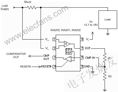 在許多應(yīng)用中,電流應(yīng)與某個設(shè)定值相比較。通常說來,進(jìn)行電流比較還需要電流分路監(jiān)控器、比較器和參考電壓。此外,理想的比較器輸出應(yīng)與大多數(shù)常見的邏輯電路很好地兼容。圖5給出了電流比較的例子。在本例中,將電流與采用TIINA200系列電流分路監(jiān)控器和比較器的簡單單電壓結(jié)點進(jìn)行了比較。R1和R2形成分壓器,以根據(jù)INA200系列比較器的內(nèi)置0.6V電壓結(jié)點來設(shè)置電壓結(jié)點。(INA200系列的增益很有特點:INA200的增益為20,INA201的增益為50,INA202的增益為100。)