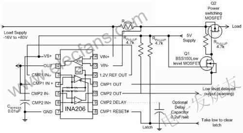 圖6在該雙電平電流比較電路中,低電平延遲輸出可對即將發(fā)生的過載發(fā)出警報,支持鎖存功能的上限可將負(fù)載電源關(guān)閉。