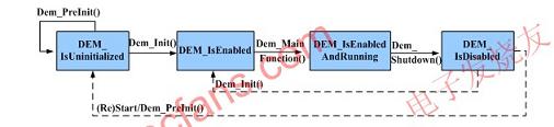 DCM模組遵循的標(biāo)準(zhǔn)與DCM相同,負(fù)責(zé)直接處理與DTC相關(guān)的服務(wù),如UDS中的0x19服務(wù)(響應(yīng)報文由DCM發(fā)送出去)。當(dāng)軟體構(gòu)件中的MonitorFunction檢測到故障或BSW模組檢測到故障時,將通知DEM模組處理和儲存‘診斷事件’(由EventID進(jìn)行標(biāo)識)。如果故障確診,唿叫NVRAMManager(非揮發(fā)性記憶體管理器)提供的介面將其存取到非揮發(fā)性記憶體中,同時通知應(yīng)用層進(jìn)行故障指示。DEM的狀態(tài)圖如圖3所示: