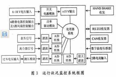 “運行狀況的監(jiān)控系統(tǒng)”具備采集動力電池的電流、電壓、溫度,以及車輛的剎車信號、離合器壓力信號、行車速度等,準確地獲取這些信號是實現混合動力驅動汽車的關鍵所在。圖3是“運行裝況監(jiān)控系統(tǒng)”的一個結構框圖。該系統(tǒng)采用兩片TLE4275和一片LM2577作為系統(tǒng)的供電模塊,輸入電壓為6~18V,可滿足車輛啟動和特殊情況下導致的蓄電池輸出電壓不穩(wěn)定而導致的監(jiān)控系統(tǒng)癱瘓。