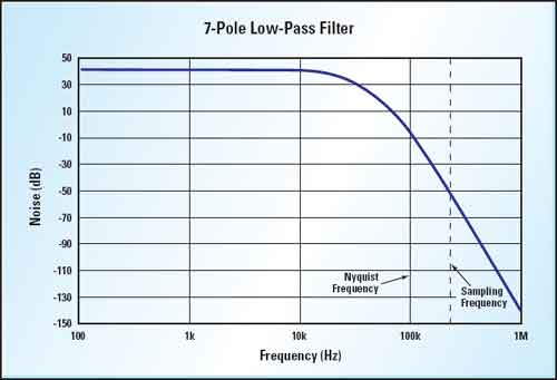 我們最好采用125倍的增益,以便多留一點(diǎn)余量。以40kHz這個最高信號頻率為例,取樣率便成為一個令人擔(dān)憂的問題。為免高于尼奎斯特頻率的混疊信號頻率,我們必須將取樣頻率的一半加以濾波,然后將振幅抑制至模擬/數(shù)字轉(zhuǎn)換器的1LSB以下。在這個例子中,我們所采用的是12位的模擬/數(shù)字轉(zhuǎn)換器,其參考電壓為4.096V,將得到1mV解析度,計(jì)算方法如下:
