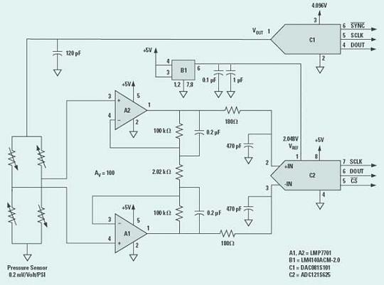 上例電路的液壓傳感器屬于電阻性電橋,傳感器的輸出取決于電阻值的變動及驅(qū)動電阻的電壓,并與兩者有函數(shù)上的關(guān)系。圖3所示的傳感器具有0.2mV/V的敏感度。DAC081S101是一款8位的數(shù)字/模擬轉(zhuǎn)換器,可以改變驅(qū)動電橋的電壓,以便為液壓測量電路提供增益控制。例如,數(shù)字/模擬轉(zhuǎn)換器輸出若設(shè)定為4V,那么全標(biāo)度液壓便可達(dá)25.6PSI。若輸出電壓為1V,全標(biāo)度液壓便高達(dá)102PSI。