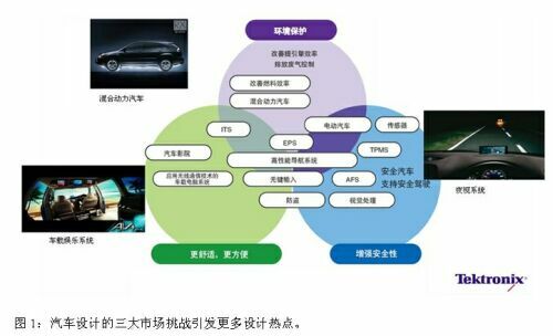 然而,面對(duì)日益復(fù)雜的汽車設(shè)計(jì)需求,特別是要推出中高端和商用的新能源汽車之時(shí),自主創(chuàng)新和開發(fā)之路并非坦途。泰克科技的專家曾在不久前舉辦的一場(chǎng)汽車電子技術(shù)論壇上以擁有“100多個(gè)ECU、軟件代碼已經(jīng)達(dá)到700萬(wàn)行”的豐田L(fēng)exus460汽車為例,強(qiáng)調(diào)了電子部件在汽車特別是高端汽車中所占據(jù)的比例越來(lái)越高。“如圖1,汽車電子關(guān)乎目前汽車設(shè)計(jì)的三大市場(chǎng)挑戰(zhàn),即如何滿足生態(tài)(環(huán)境保護(hù))、更舒適方便和增強(qiáng)安全性的要求,而圍繞解決這些挑戰(zhàn)的系統(tǒng)和子系統(tǒng)正是目前汽車電子設(shè)計(jì)的熱點(diǎn)和難點(diǎn)。”他指出。“而局域網(wǎng)、動(dòng)力系統(tǒng)、電子控制單元和數(shù)字RFID的應(yīng)用在改善汽車生態(tài)學(xué)、安全性和舒適性方面扮演了重要的角色。