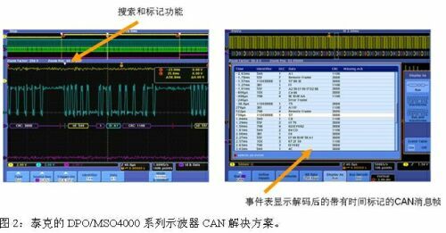 對(duì)于汽車中常用的CAN、LIN這類低速串行總線的調(diào)試,泰克的DPO/MSO4000系列示波器提供了簡(jiǎn)單、易用、完整、高品質(zhì)的觸發(fā)、捕獲和解碼解決方案。如圖2,該示波器系列提供了搜索和標(biāo)記功能,可在事件表顯示解碼后的帶有時(shí)間標(biāo)記的CAN消息幀,這一功能是其他競(jìng)爭(zhēng)性產(chǎn)品所不具備的。