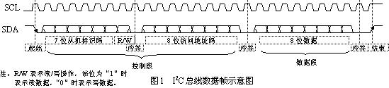 如圖1所示是常見(jiàn)的I2C總線上傳輸?shù)囊蛔止?jié)數(shù)據(jù)的數(shù)據(jù)幀,其總線形式是由數(shù)據(jù)線SDA和時(shí)鐘SCL構(gòu)成的雙線制串行總線,并接在總線上的電路模塊即可作為發(fā)送器(主機(jī))又可作為接收器(從機(jī))。幀數(shù)據(jù)中除了控制碼(包括從機(jī)標(biāo)識(shí)碼和訪問(wèn)地址碼)與數(shù)據(jù)碼外還包括起始信號(hào)、結(jié)束信號(hào)和應(yīng)答信號(hào)[4]。
