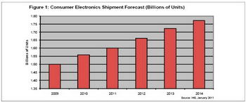 預(yù)計2011年消費(fèi)電子產(chǎn)品出貨量將達(dá)到16億個,而2010年是15.6億個。消費(fèi)電子包括多種我們熟悉的產(chǎn)品,消費(fèi)者每天都會用到,如電視、立體聲和音頻部件、便攜媒體播放器、機(jī)頂盒、游戲機(jī)、DVD和藍(lán)光播放器、數(shù)碼相機(jī)、投影儀和攝像機(jī)、數(shù)字相框、電子書閱讀器和消費(fèi)電器。