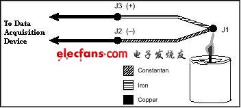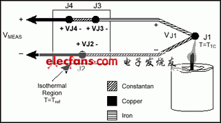 圖3中,J2和J4接點(diǎn)屬于同一類型(銅鎳合金);因?yàn)閮烧咛幱诘葴丨h(huán)境,J2和J4也是同樣的溫度。因?yàn)殡娐分须娏鞣较蚓壒剩琂4端產(chǎn)生一個(gè)Seebeck正電壓,J2端產(chǎn)生一個(gè)Seebeck負(fù)電壓。因此,接點(diǎn)抵消了相互之間的影響,測(cè)量電壓的總量就為零。J1和J3接點(diǎn)都是鐵—銅鎳合金接點(diǎn)。但是他們的溫度可能不同,因?yàn)樗麄兛赡懿皇窃诘葴丨h(huán)境中。因?yàn)樗麄兲幱诓煌瑴囟拳h(huán)境下,J1和J3接點(diǎn)都可以產(chǎn)生Seebeck電壓,但是大小不同。為了補(bǔ)償冷端J3,測(cè)量其溫度并將其作用電壓從熱電偶測(cè)量中減去。
