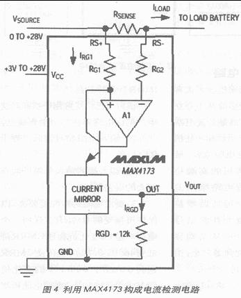 MAXIM推出了一系列雙向或單向電流檢測(cè)IC,有些雙向電流檢測(cè)IC內(nèi)置檢流電阻,可檢測(cè)流入或流出被檢電路的電流大小并通過(guò)一個(gè)極性指示引腳顯示電流方向。增益可調(diào)的電流檢測(cè)IC、固定增益(+20V/V,+50V/V,或+100V/V)電流檢測(cè)芯片或包括單雙比較器的固定增益電流檢測(cè)IC,都采用小體積封裝,如SOT23,可滿足對(duì)尺寸要求苛刻的應(yīng)用。圖4是用MAX4173構(gòu)成的高端電流檢測(cè)電路。[page]