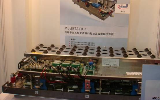 由于在大功率IGBT上有很大的優(yōu)勢(shì),英飛凌這次幾乎將一個(gè)風(fēng)電站搬到了會(huì)場(chǎng),現(xiàn)場(chǎng)展示了其最新ModSTACK平臺(tái),據(jù)介紹,這個(gè)平臺(tái)采用水冷方式,效率更高,可以用于大型風(fēng)電站,輸出功率達(dá)到2兆瓦!