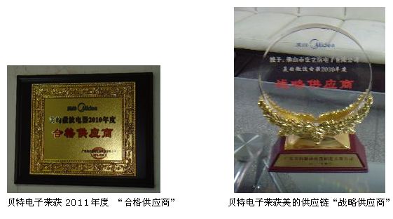 與美的合作近8年來,貝特電子有限公司憑借過硬的產(chǎn)品質(zhì)量,極強(qiáng)的研發(fā)能力,優(yōu)質(zhì)的售前售后服務(wù),成功獲得“合格供應(yīng)商”及“戰(zhàn)略供應(yīng)商”兩項(xiàng)大獎,并得到獎金3萬元。